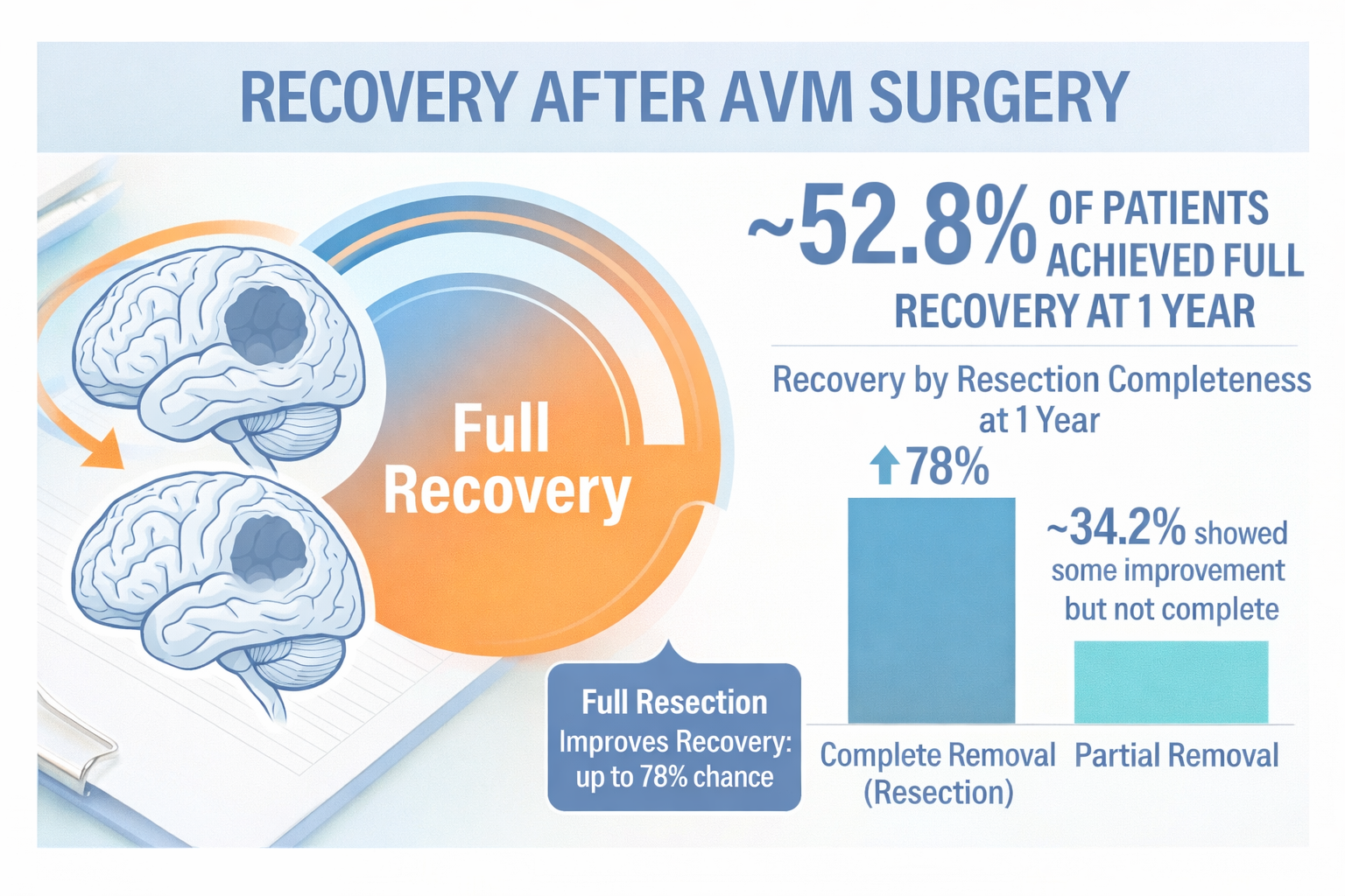 - Full resection improves recovery: Patients with complete AVM removal had up to 78% chance of full recovery at one year