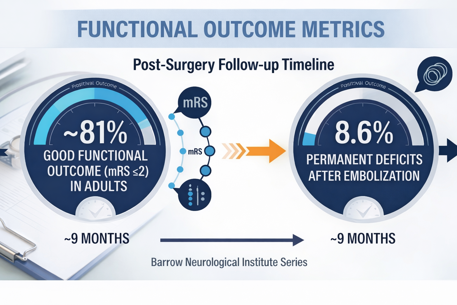 - Good functional outcome (mRS ≤2) in adults after AVM surgery is achieved by ~81% at ~9 months follow-up
