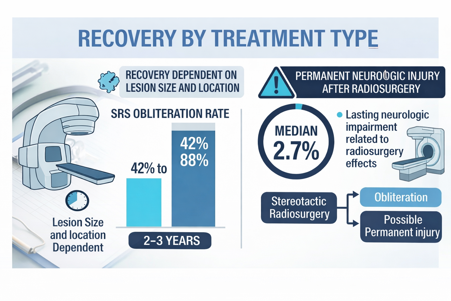 - Stereotactic radiosurgery obliteration rate: 42–88% over 2–3 years, recovery dependent on lesion size and location