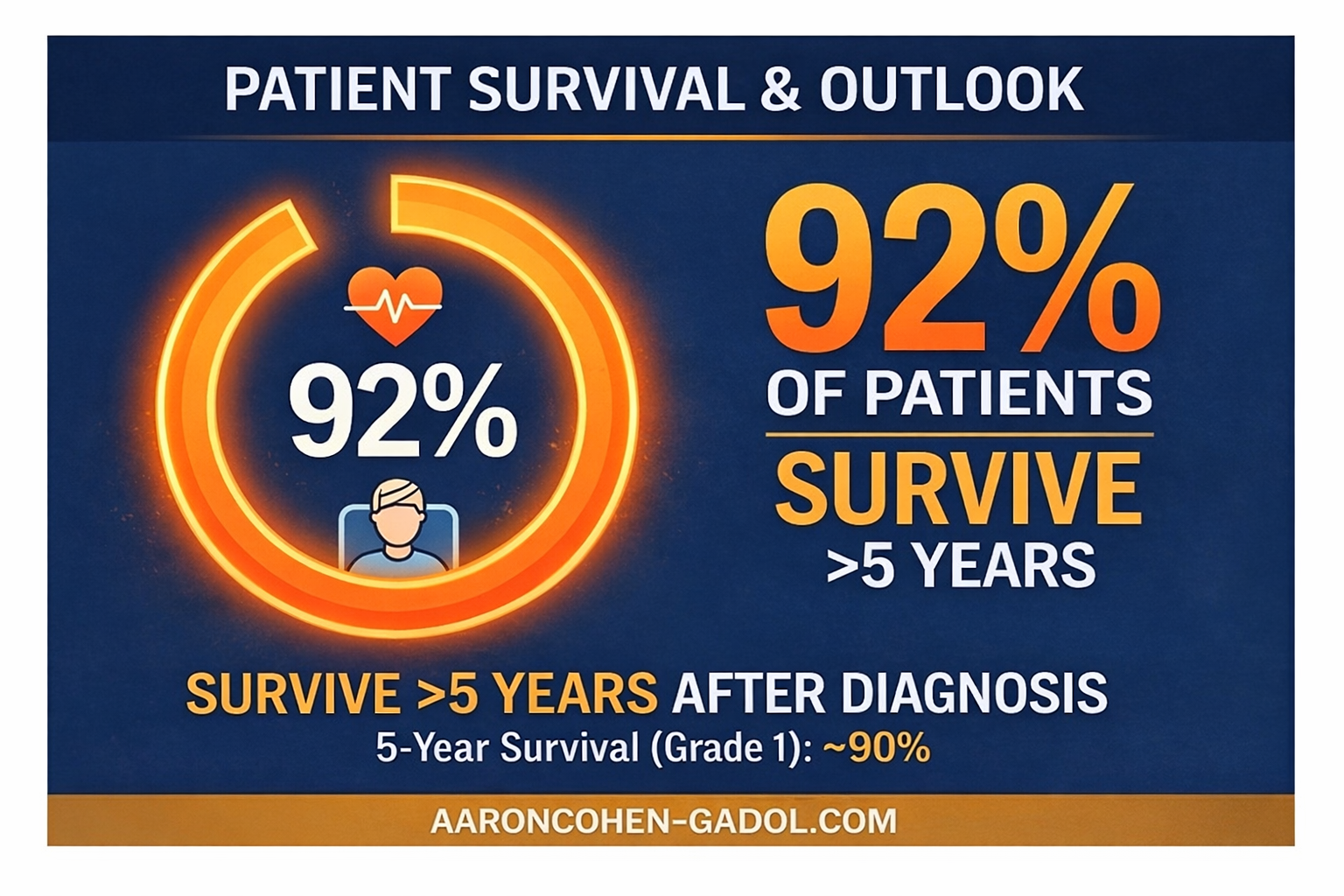 - 5-year survival (benign/Grade 1): ~90%