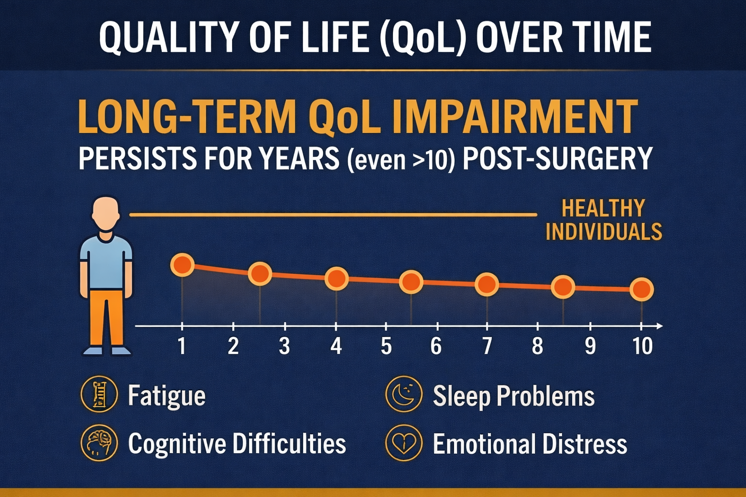 - Long-term QoL impairment can persist for years (even >10 years after surgery)