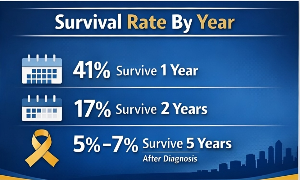 On average, survival is about 12 to 18 months. Around one in four patients live beyond a year, while only about 5% make it past five years.